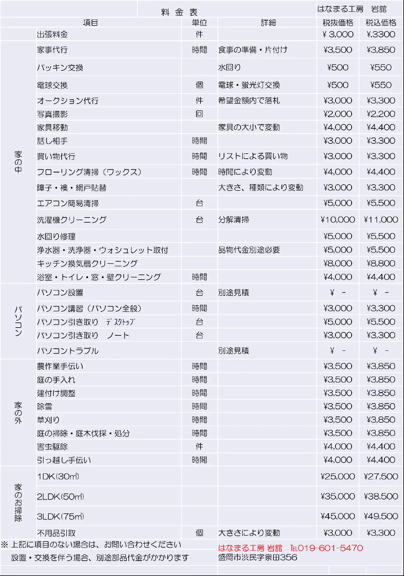 はなまる工房 料金表